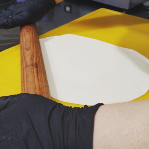 La piadina viene impastata tutti i giorni, tirata a mano e cotta alla piastra.